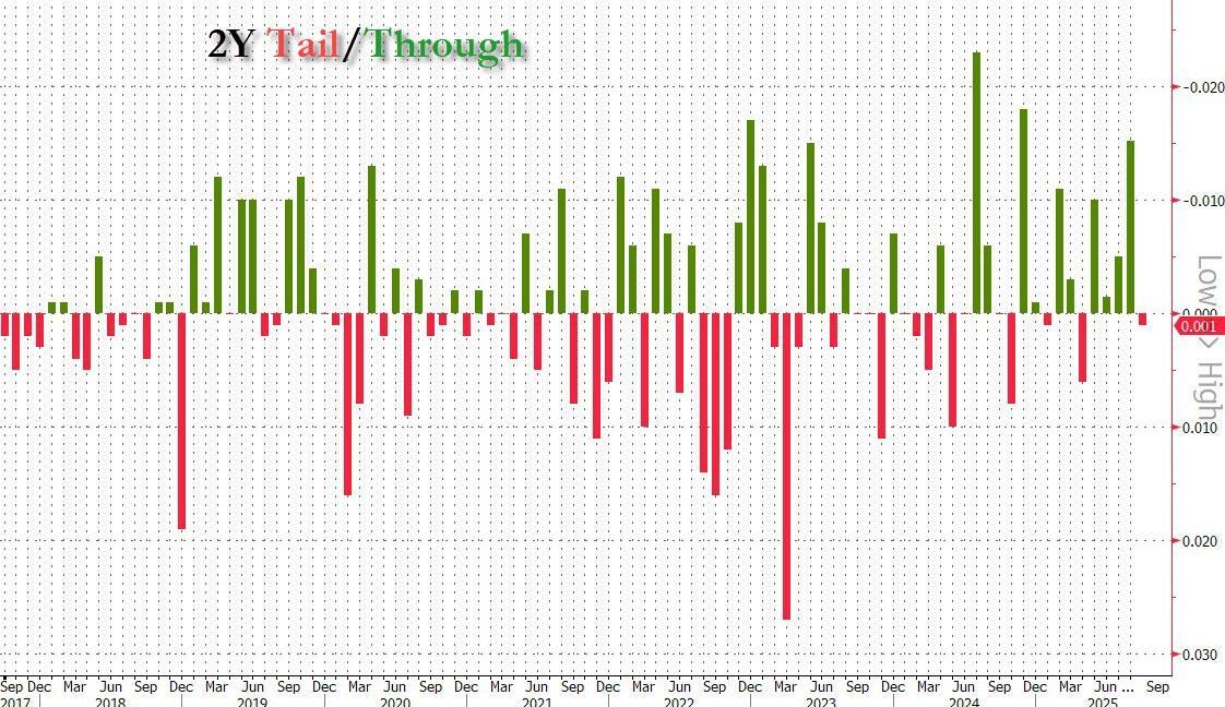 The first coupon auction of the week closed without a glitch, with the $69 billion in 2Y bonds offered pricing at 3.571%, down from 3.641% last month and the lowest since Sept 2024 when the US underwent its latest growth scare. The auction also stopped through the 3.572% When Issued by 0.1bps, a smaller margin than last month's 1.5bps, but the fifth consecutive through in a row.