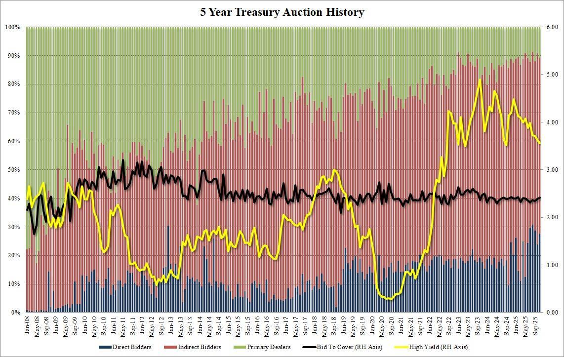 After yesterday's sale of $69BN in 2Y notes, which came smack in the middle of market expectations with metrics that were just about average, moments ago the US Treasury sold $70BN in 5Y notes at a high yield of 3.562%, down from 3.625% last month and the lowest since last September when the Fed launched its current rate cut cycle; the auction tailed the When Issued 3.557% by 0.5bps, and was the 5th tailing 5Y auction of the past 6.