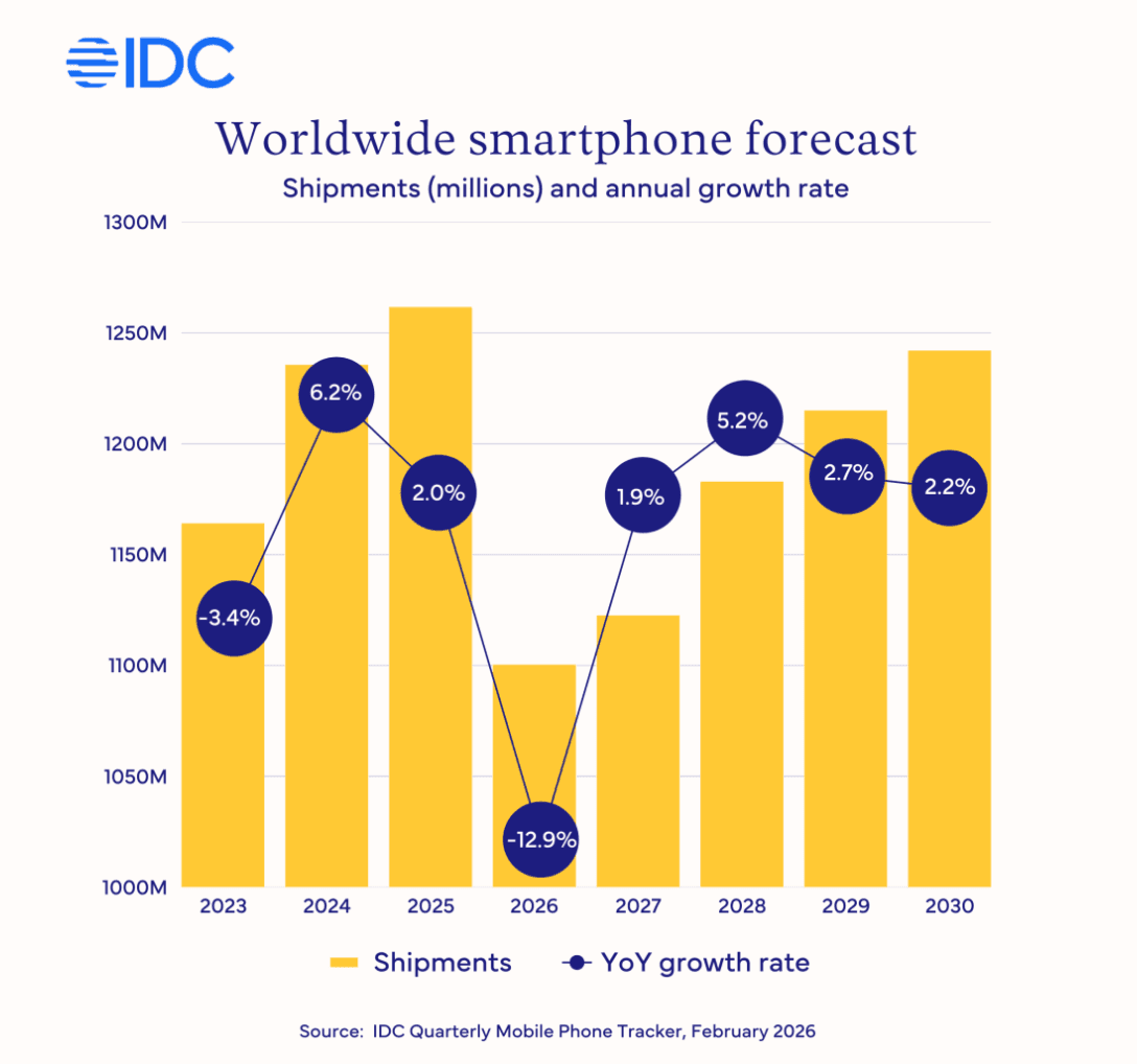 IDC estimates that global smartphone shipments will plunge 12.9% in 2026 to 1.1 billion units, the lowest annual level in over a decade. This outlook is much gloomier than IDC's November forecast.