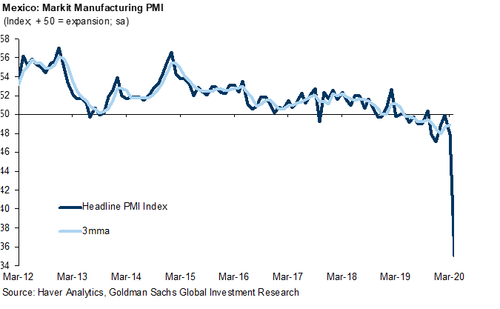 While few have lofty expectations for economic performance with the global economy still largely shutdown, what is happening in Mexico is simply unprecedented. Here are some striking observations detailing the unprecedented economic collapse of the southern US neighbor, courtesy of Goldman.
