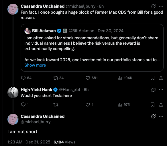 Early Wednesday morning, Burry posted on X about a prior credit default swap trade he made with Bill Ackman. In response, an X user asked, "Would you short Tesla here?"