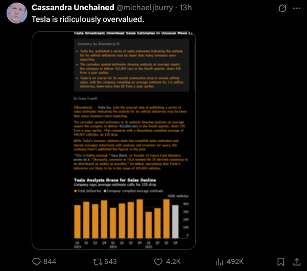 On Tuesday, Burry posted a screenshot on X of a Bloomberg article covering Tesla delivery estimates from sell-side analysts that showed continued gloom. He added, "Tesla is ridiculously overvalued."