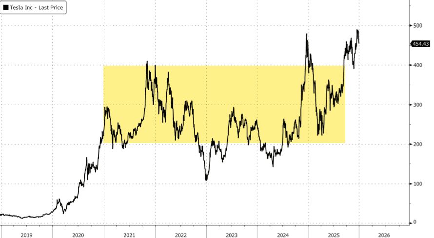Tesla shares are up 12.5% year to date as of Tuesday's close. The stock has broken above a four-year lateral trading range, with $400 now the key level to hold.