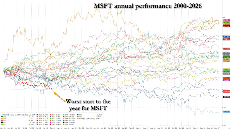 Microsoft shares were trading lower Thursday afternoon, leaving the stock deeper in bear-market territory and down about 24% on the year. Seasonal data suggests it is the worst start to a year for Microsoft on record.