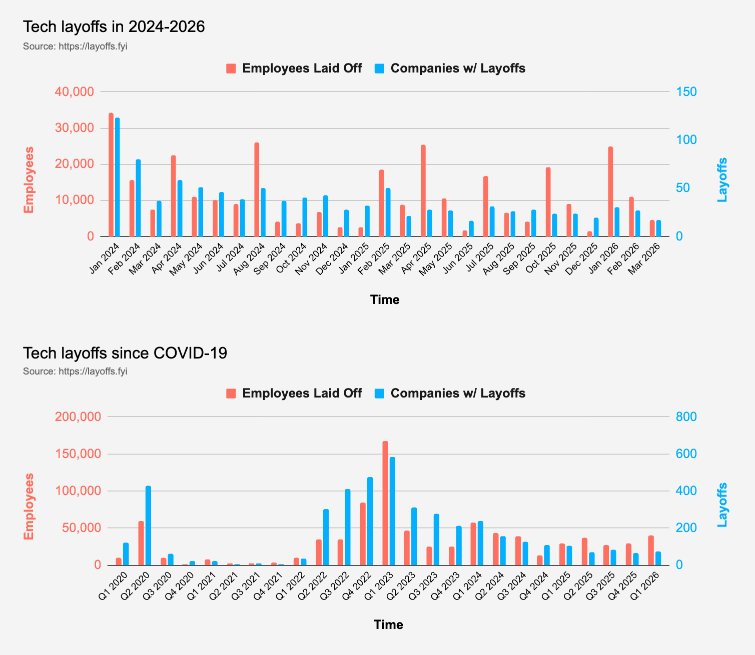 Layoff tracker Layoffs.fyi shows 71 tech companies have axed nearly 40,500 jobs so far this year. Layoffs are nowhere near the levels seen during the tech job-cut apocalypse between 2Q22 and 2Q23.