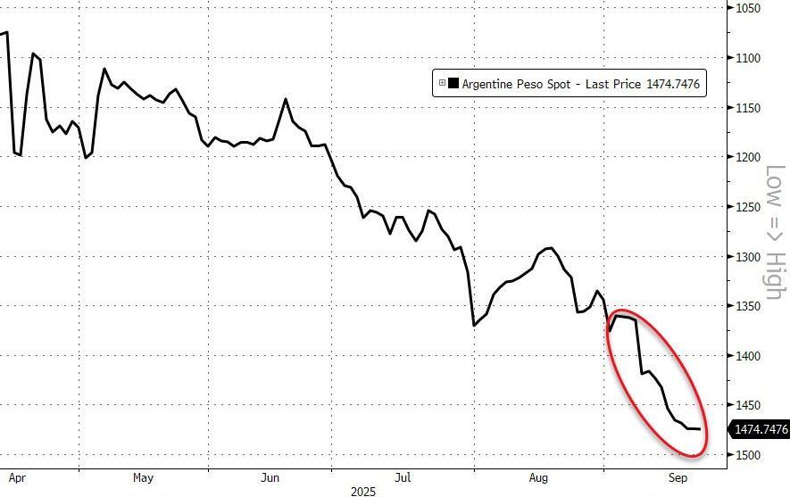 Following his government's resounding loss in local elections - seen as a harbinger of next month's congressional races - Argentine President Milei is facing a renewed crisis as the embattled South American country's currency is collapsing amid fears that he will scrap his defense of the peso (which has already cost hundreds of millions of dollars) and let it plunge as so many of his predecessors have done.