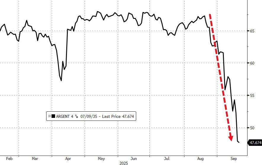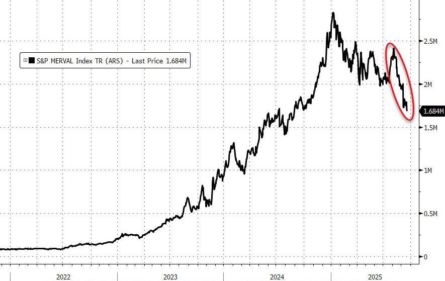 As Bloomberg points out, it’s a stark change of fortunes for Milei, whose deep spending cuts and sweeping reforms had been welcomed by global investors soon after the libertarian economist took office in late 2023, setting off rallies across its financial markets. Inflation soon began to ease, falling below 100% and shoring up support for Milei for a while. But as he’s started to suffer political setbacks that hurt his ability to keep pushing through his agenda, the country’s bonds, stocks and currency have all come tumbling back down.