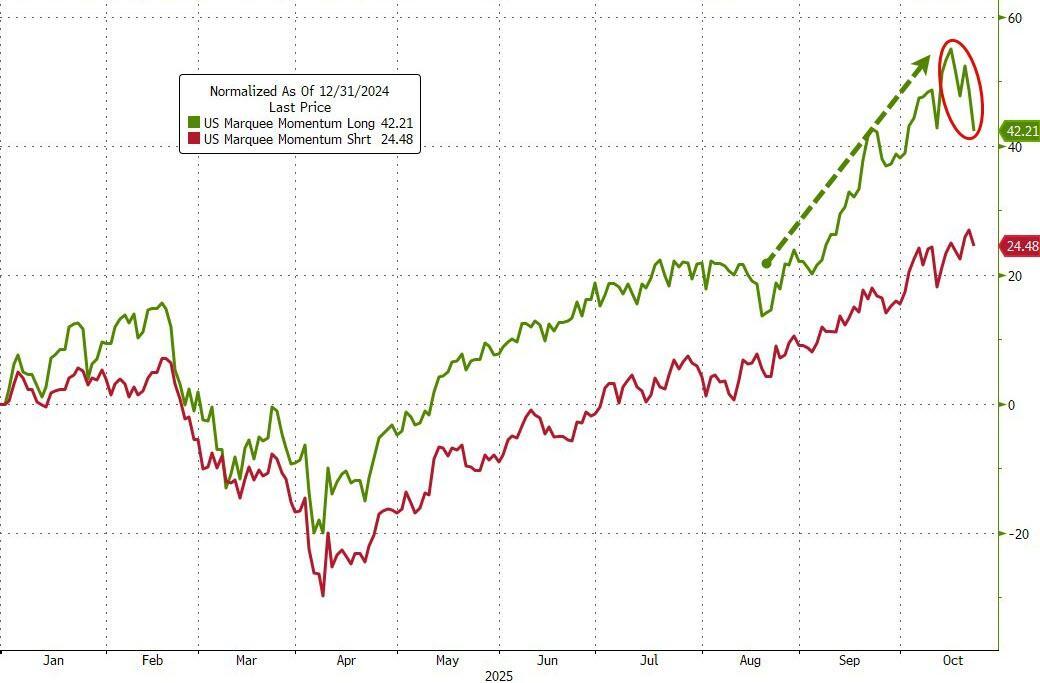 The last six days have seen momentum longs dumped and momentum shorts bid (until today), hitting the overall momentum market with a double whammy.