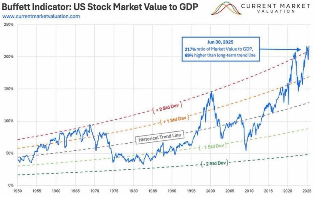 Consider the valuation extremes. The S&P 500 trades at 26 times trailing earnings, and the CAPE ratio hovers near 40x, levels seen only in the height of historic bubbles. The total stock market’s capitalization now exceeds 217% of U.S. GDP, a ratio Warren Buffett once identified as a warning flag. In the MarketWatch narrative: “The market, by this measure, is near the all-time peak reached during the epic bubble around the turn of the millennium.” Those numbers don’t lie.