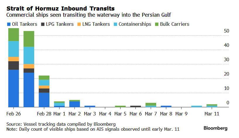 There were eight commercial transits on Tuesday and four more were identified early Wednesday, most of which have ties to Iran or have Chinese commercial links, according to vessel-tracking data compiled by Bloomberg.