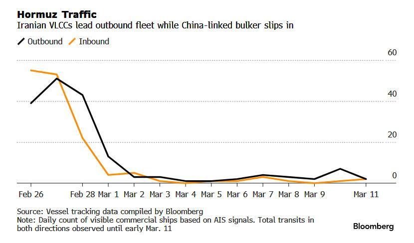 This morning, Bloomberg confirms that while mainstream Western shipping remains largely suspended through the Strait of Hormuz, recent 24-hour observations reveal a jump in Iran-linked traffic, specifically involving two sanctioned (read China-focused) VLCCs.