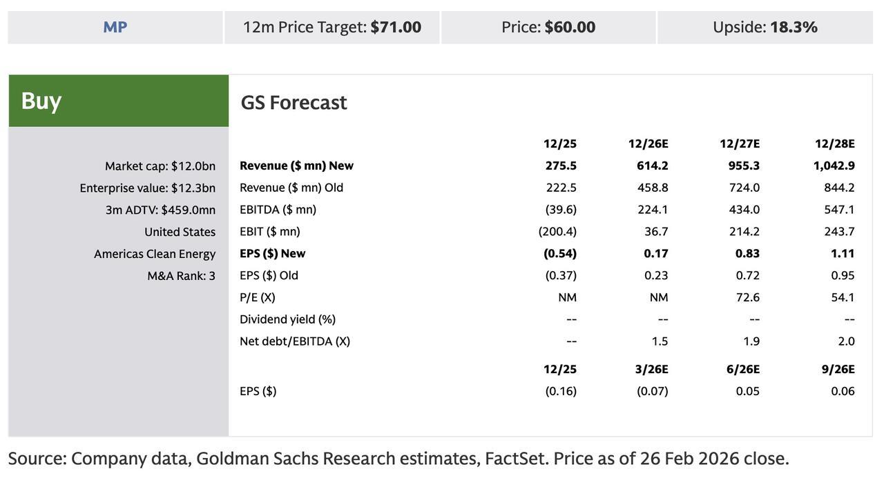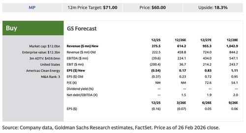 Looking ahead, Goldman underscored management’s confidence in ramping NdPr volumes to a 6,000 metric ton run rate exiting 2026, with first quarter volumes expected to rise roughly 20% sequentially and a heavier acceleration into the fourth quarter of next year. MP remains on track to commission dysprosium and terbium separation capacity in mid-2026, marking another key milestone in expanding its heavy rare earth capabilities and strengthening its vertically integrated platform, Goldman wrote.