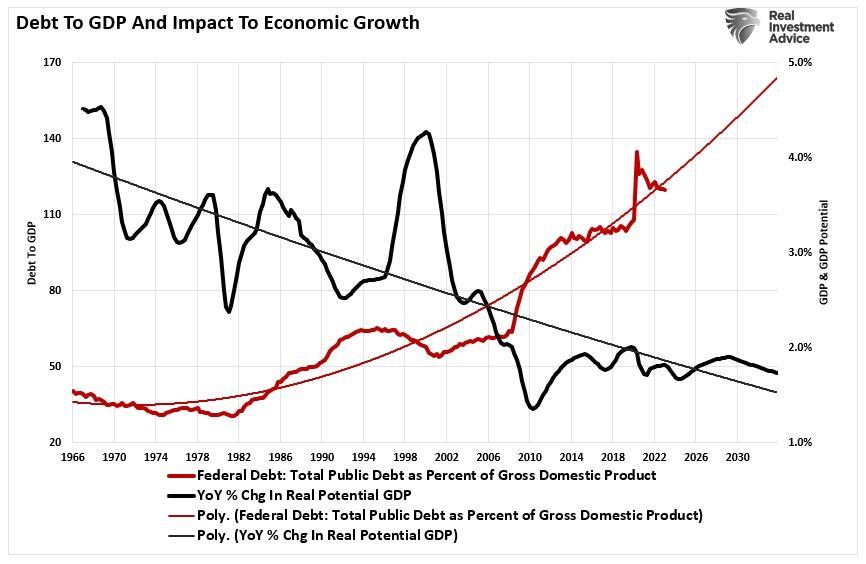 However, the facts show us that rising debts and deficits lead to lower interest rates, not higher. The reason is that debt diverts capital from productive uses into debt service. As such, economic growth slows. We can see this visually by comparing the Federal debt as a percentage of GDP to potential economic growth. Since government spending is primarily non-productive, it should be unsurprising that increases in debt do not foster more vigorous economic activity.