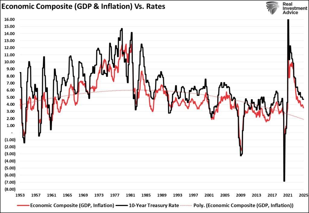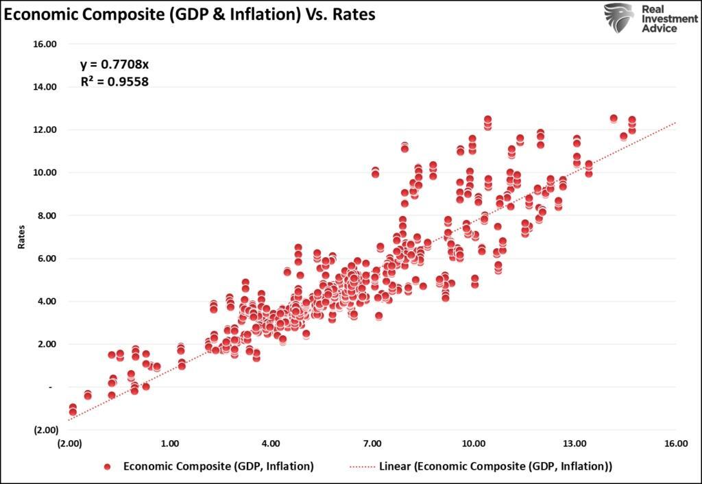 Where Dalio and other media bears are incorrect in their view is that the recent surge in inflation, and ultimately interest rates, was not a function of organic economic growth. It was a stimulus-driven surge in the supply/demand equation following the pandemic-driven shutdown. As those monetary and fiscal inflows reverse, that support is fading. In the future, we must understand the factors that drive rates over time: economic growth, wages, and inflation. Visually, we can create a composite index of GDP and inflation versus interest rates.