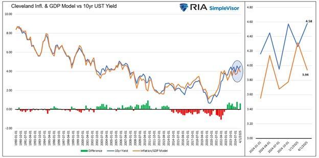 The two graphs below, updated from the January article, illustrate the strong historical correlation between ten-year bond yields and our model, which is based on inflation, inflation expectations, and economic activity. Currently, the fair value yield of the ten-year UST is 3.94%, approximately 64 basis points below the actual yield. The gap between the fair value and the bond’s yield is technically referred to as the term premium. The term ‘premium’ quantifies all non-model factors that impact yields. Today, the divergence can largely be explained by deficits and tariff-related inflation concerns, i.e., the current narratives.