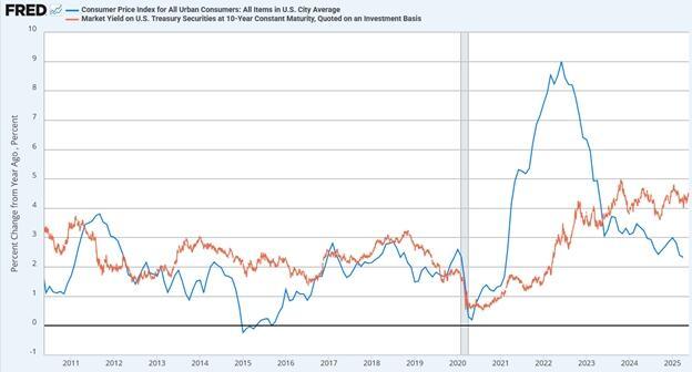 The following graph provides historical context for the relationship between yields and inflation. Yields jumped in 2021 and 2022 as inflation rose to a peak of 9%. Since then, inflation has fallen rapidly and is nearing the Fed’s 2% target. However, bond yields remain near their highs, trading in a wide range spanning 3.75% to 5.00%.