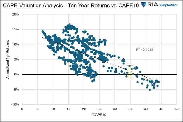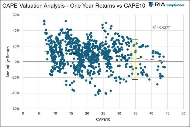 To better appreciate this, consider the first graph below, which shows the correlation between the CAPE10 for the S&P 500 and the one-year returns following each monthly valuation. The chart encompasses 75 years of data. As we highlight, we can expect a one-year performance range of approximately plus or minus 20% at current valuations. Moreover, with an R-squared of .0277, we have no confidence in that forecast.
