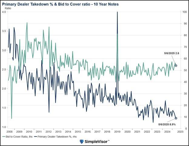 Despite being much larger than the 20-year bond, the 10-year auction was met with strong demand, as seen in the graph below. Primary dealers (direct bidders), the backstop for Treasury auctions, account for the third-lowest allotment since at least 2008 at 8.9%. This signifies that demand from other sources was robust.