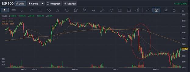 On May 6th, despite the outstanding 10-year auction, bonds eked out a small gain. The meh 20-year auction and the bearish narratives it fed pushed prices significantly lower. Furthermore, the fear emanating from the 20-year auction sent shockwaves to the stock market, which, as circled below, fell rapidly following the announcement of the auction results.