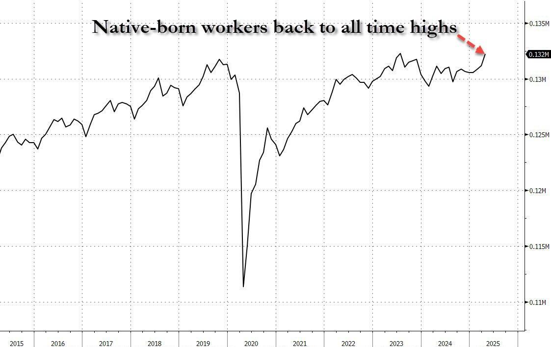 We bring this up because deep inside today's jobs report we got the best news yet: after literally flatlining in late 2019, having plunged during covid and barely recovering to its pre-covid levels, the number of native born workers is now back to its all time high, 132.228 million.