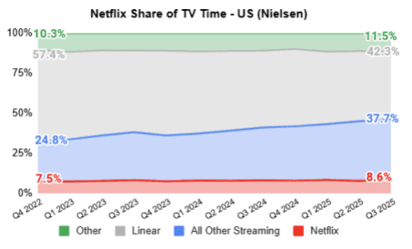 NFLX also discussed its content slate, which according to the company "helped drive record TV view share in Q3 in the United States and the United Kingdom , two of our largest markets. Based on Nielsen and Barb data, from Q4’22-Q3’25, our quarterly 4 TV view share has grown 15% and 22% in the US and UK, respectively, as you see in the charts below. Given the still substantial amount of linear viewing globally, we believe there’s plenty of opportunity to expand our share of TV engagement, if we continue to improve."