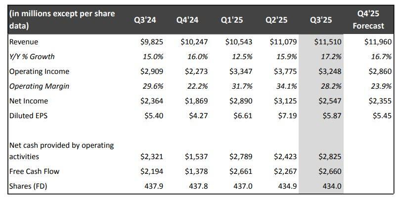 Q3’25 operating income totaled $3.2B, up 12% year over year. Operating margin was 28% vs 30% in Q3’24. This was below our guidance forecast because we incurred an expense in Q3’25 of approximately $619 million related to an ongoing dispute with Brazilian tax authorities regarding certain non-income tax assessments. This expense was not included in our prior guidance forecast but was identified as a potential exposure in our prior 10-Q and 10-K filings. The expense, which covers periods from 2022 through Q3’25, was booked as a cost of revenue. The cumulative impact of this expense (approximately 20% of which is for the year 2025 with the remainder related to 2022-2024) reduced our Q3’25 operating margin by more than five percentage points. Absent this expense, we would have exceeded our Q3'25 operating margin forecast, and we don’t expect this matter to have a material impact on our results in the future. Diluted EPS was $5.87 vs. $5.40 last year (+9% year over year), $1.00 below forecast due to lower than forecasted operating income.