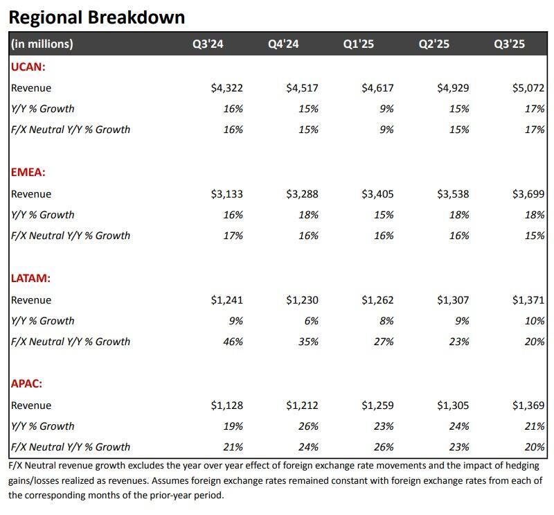 - EMEA revenue $3.70 billion, +18% y/y, beating estimate $3.68 billion
