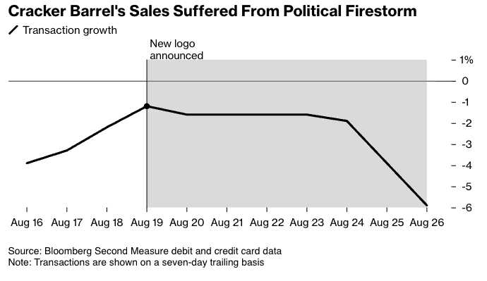 This brings us to new data from Bloomberg Second Measure on debit and credit cards, showing that Masino's decision to abandon the restaurant chain's half-century-old logo - long a symbol of rural Americana and the "old country store" experience - sparked the beginning of a boycott.