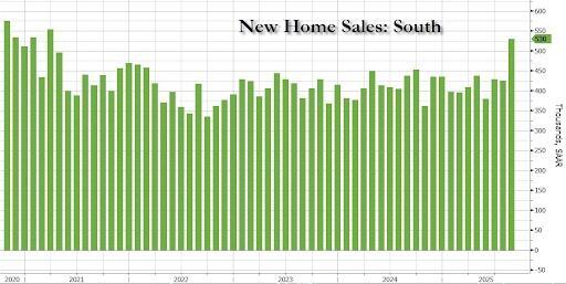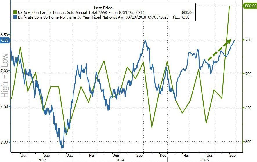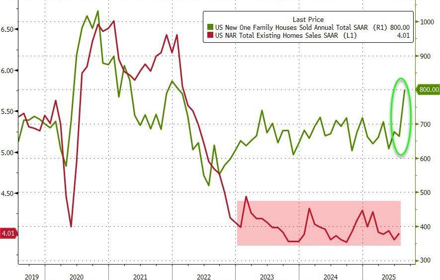 The total new home sales SAAR surged to 800k (its highest since Dec 2021) and completely decoupled from existing home sales...