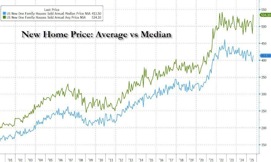 The median new home price rose 1.9% y/y to $413,500, but the average selling price soared near record highs at $534,100...