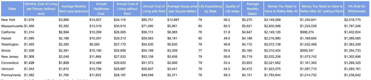 New York tops the list, requiring a staggering $2,018,775 to retire early, largely due to sky-high rent averaging $3,886/month and annual healthcare costs of $14,007, according to a Falcon Funded.
