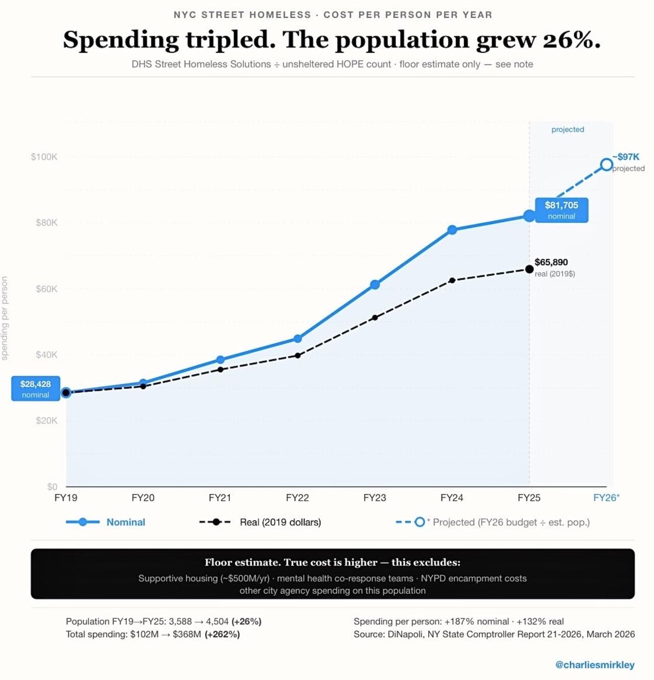 Spending through the city’s New York City Department of Homeless Services street outreach programs has increased sharply over the past several years. In 2019, the city spent about $102 million on these services, averaging around $28,000 per unsheltered individual. By the 2025 fiscal year, the average cost had risen to about $81,000 per person, close to the city’s median household income of $81,228.