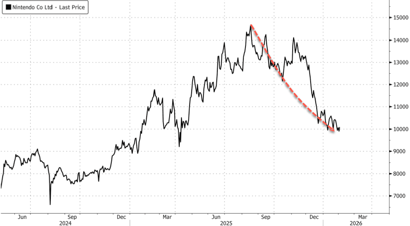 Dark storm clouds have gathered over Nintendo since the start of December, as investor concerns mount over tariffs, rising memory prices, and chatter about soft US holiday sales. The stock in Tokyo remains about one-third below its August peak.
