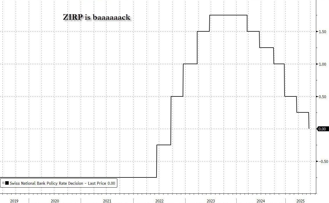 Five years after covid sparked a once in a generation inflationary surge and forced all central banks to push their interest rates well above the zero (and in some cases negative) lower bound which defined the post-QE era, overnight the Swiss National Bank became the first to show that the world of higher rates is over and ZIRP is coming back, after the central bank cut its rate from 0.25% back to 0.00% for the first time since 2022.
