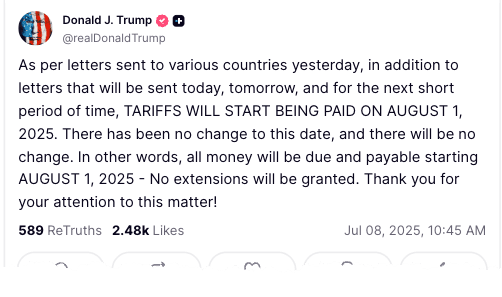 No more TACO: Trump says Aug 1 tariff deadline won't be extended pic.twitter.com/OvqtW0Z5aB