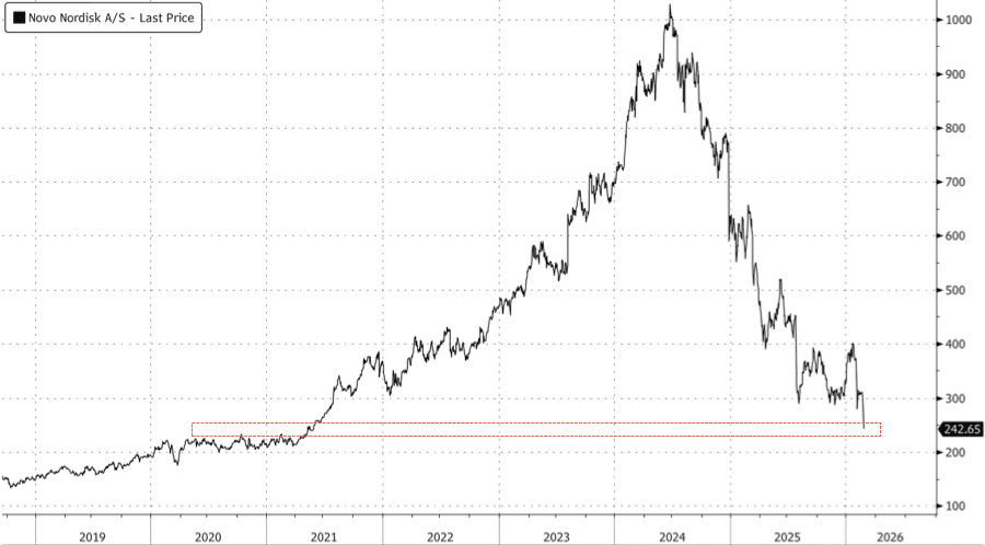 Novo Nordisk shares in Copenhagen can't catch a bid. The liquidation is accelerating again after a Bloomberg headline on Tuesday morning: the Danish drugmaker will slash U.S. list prices for Wegovy and Ozempic next year. The move suggests that the new CEO is pursuing market share amid intensifying competition in the GLP-1 space.
