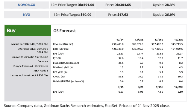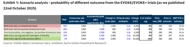 This morning (November 24th), Novo announced that the EVOKE/EVOKE+ trials of semaglutide in Alzheimer's disease did not hit the primary endpoint, as no efficacy difference was seen between the treatment and placebo arms, leading to the 1-year extension study to be discontinued. Topline results will be presented at the CTAD conference on December 3rd, and Novo noted that semaglutide behaved as expected on all other known characteristics (safety, tolerability etc). Our expectations into the trial were low, as we forecast 5% probability of c.$4bn in peak sales for semaglutide in Alzheimer's disease and while the DCF impact on our model is limited (<1% decline on taking EVOKE out of the model), our scenario analysis suggested c.4% downside to the shares in this scenario. Our investor conversations suggested that downside risk could be >4%, given potential concerns over 2026 growth. However, we note that these concerns should largely be included in the stock given the recent step down on commentary around FY26 headwinds, and while the stock is trading down c.8% at the time of writing we believe the stock could underperform by LSD-MSD based on the trial failure.