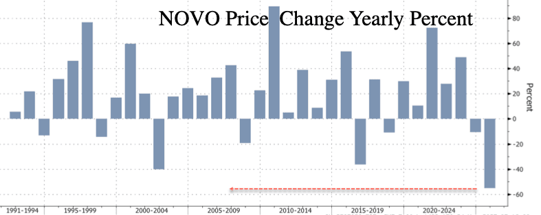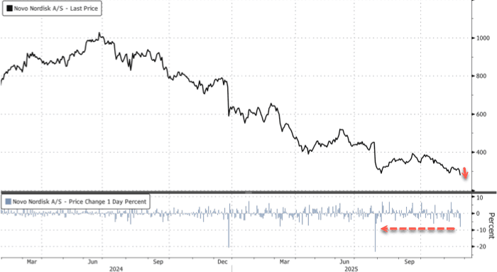 The dismal results sent Novo shares tumbling nearly 10% in Copenhagen by afternoon trading, the steepest intraday drop since the 23% crash on July 29. The stock is now down 55% year-to-date, hitting levels last seen in mid-2021. Novo ADR shares are down 9%.