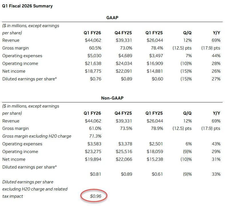 On the revenue side, NVIDIA was unable to ship an additional $2.5 billion of H20 revenue in the first quarter (the company said that sales of H20 products were $4.6 billion for the first quarter of fiscal 2026 prior to the new export licensing requirements). Excluding the $4.5 billion charge, the company said Q1 non-GAAP diluted earnings per share would have been $0.96.