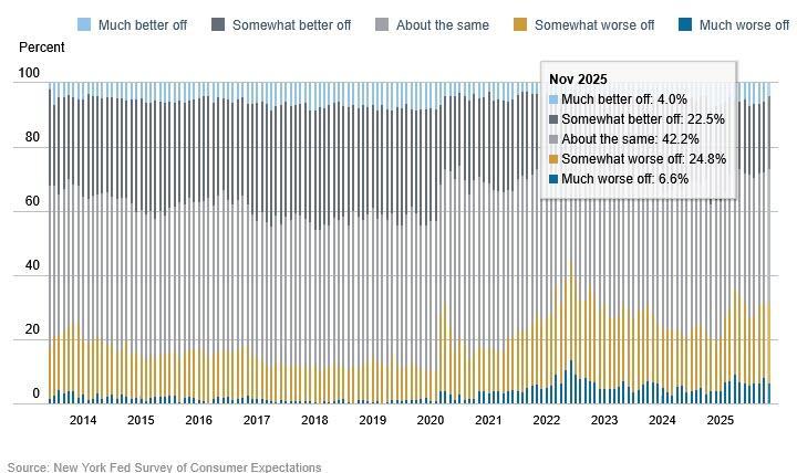 US consumer inflation expectations were stable in November while perceptions about households current financial situations deteriorated "notably" and perceptions about job prospects improved, according to the latest Survey of Consumer Expectations from the Federal Reserve Bank of New York.