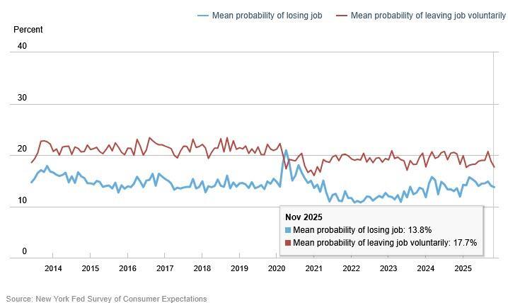 The perceived probability of losing one’s job fell 0.2% to 13.8%, marking the lowest reading this year. At the same time, the mean probability of leaving one's job voluntarily also slumped to 17.7%, the lowest since February.