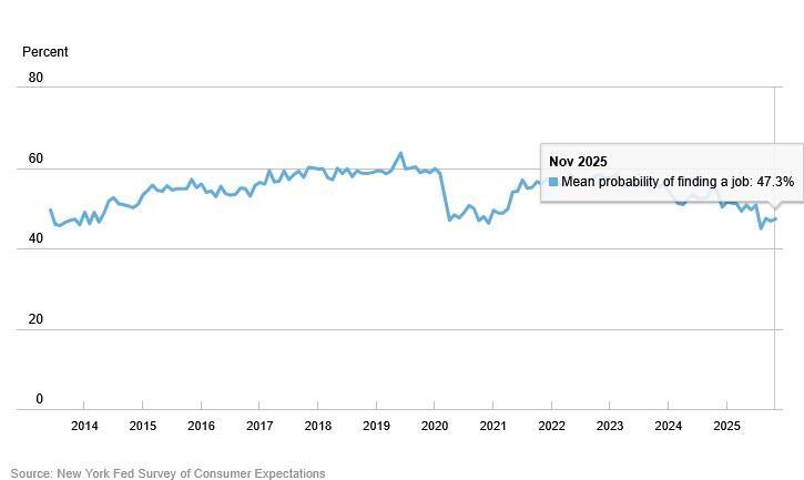 The survey showed consumers largely were more optimistic about the labor market in November than a month earlier, marking down the chances of a higher unemployment rate a year from now and reporting better odds of finding a job if they were to lose theirs.