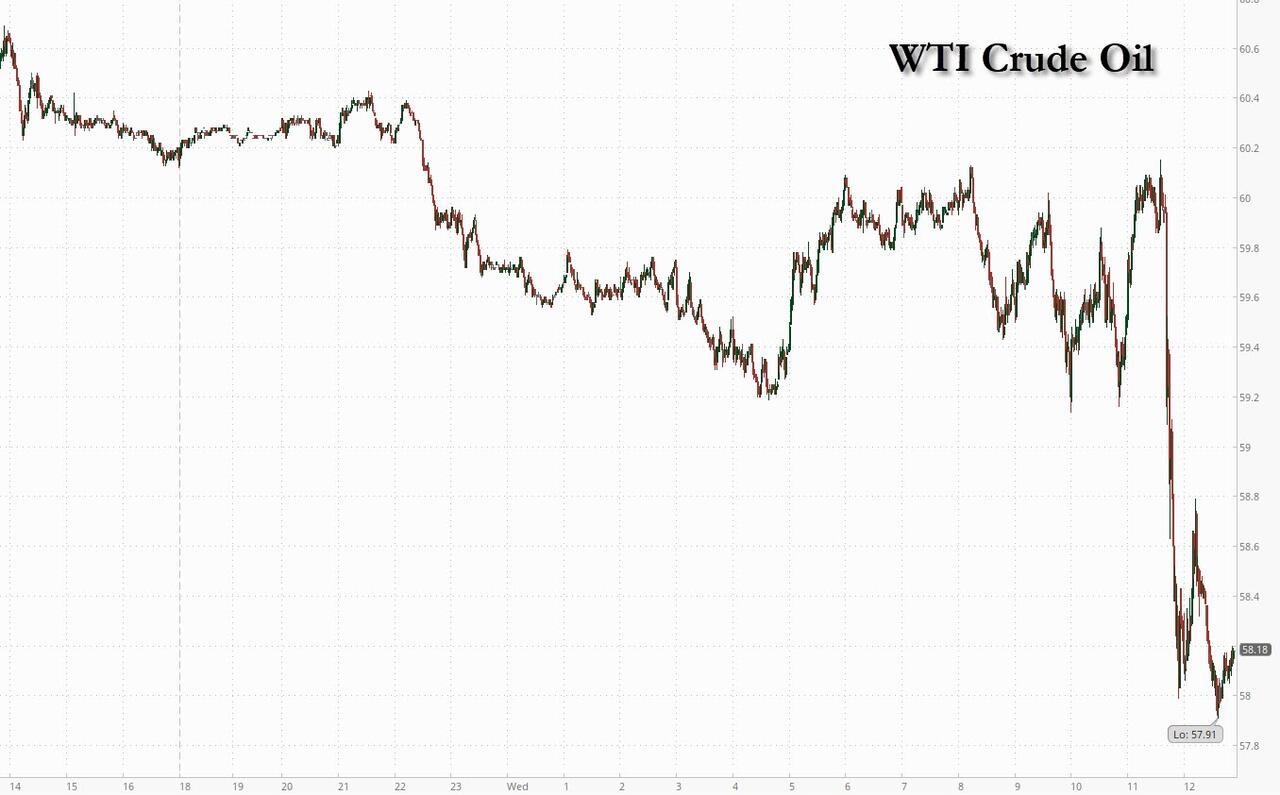 For now the market is voting "yes", and the news sent WTI tumbling as much as 4%,or more than $2 to just under $58, the lowest price since early 2021 (and a level which was only briefly breached after Trump's Liberation Day sent oil to $55 before rebounding rapidly).