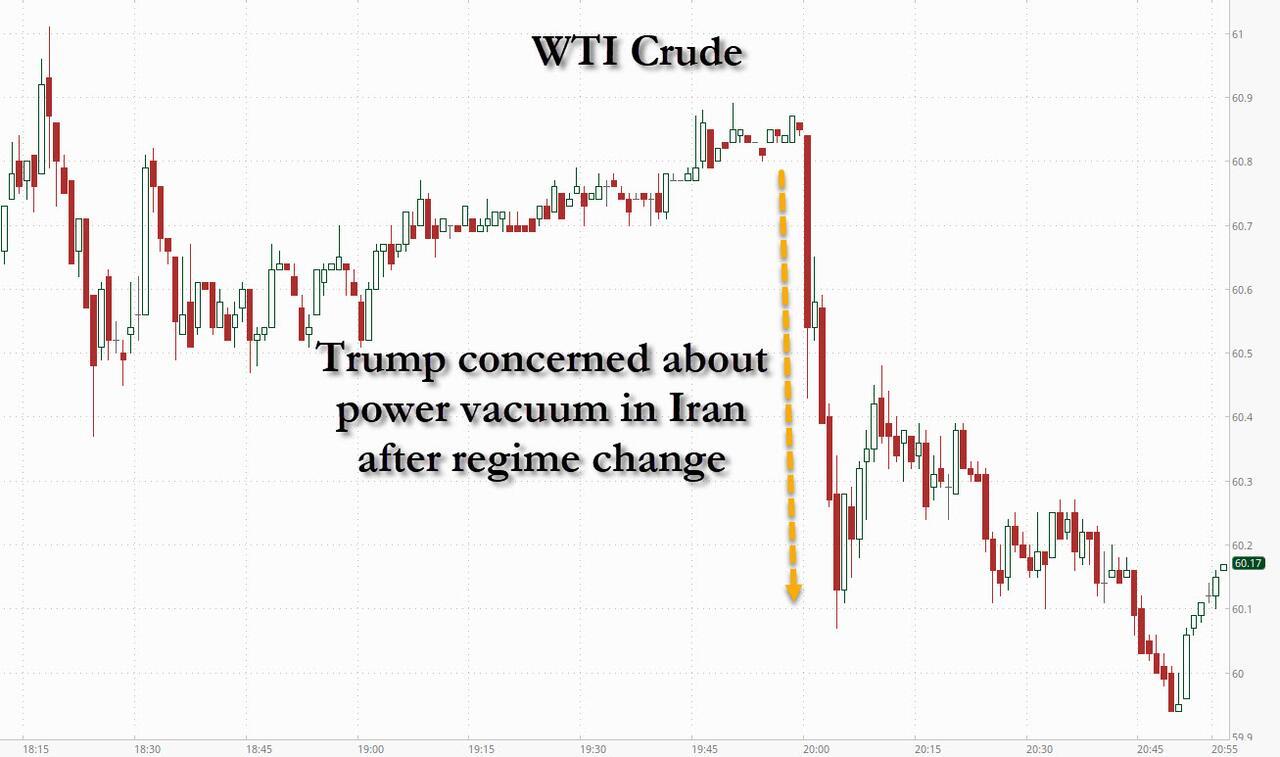Trump's comments to Reuters and the NBC report have effectively eliminated the probability of an imminent action, and as a result crude oil, which was rising again on geopolitical fears, tumbled with WTI set to dip below $60 after trading above it all day...