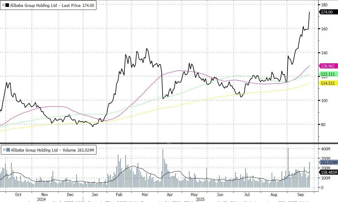 Alibaba stock gained nearly 10%, the largest single day return since the +18.5% gain post earnings earlier in Sep which brings MTD gains for this mega-cap name to an incredible +50%. The HK line is now trading at 4-year highs.