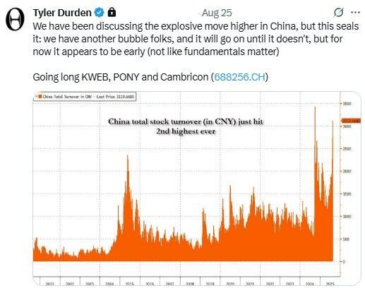The good news doesn’t just stop there – elsewhere in China Internet space, Meituan +1.2% and JD +3.3% also climbed as the “anti-involution” drive finally comes to food delivery space after months-long price war: the SAMR released draft rules to regulate food delivery platforms with a focus on fees, promotions, and safety. The anti-monopoly watchdog calls for “fair competition” and seeks to halt “price wars”. Tencent +2% was not left behind either, stock climbing along with other gaming names as its title “Delta Force” has become one of the most downloaded apps on the Apple App Store.