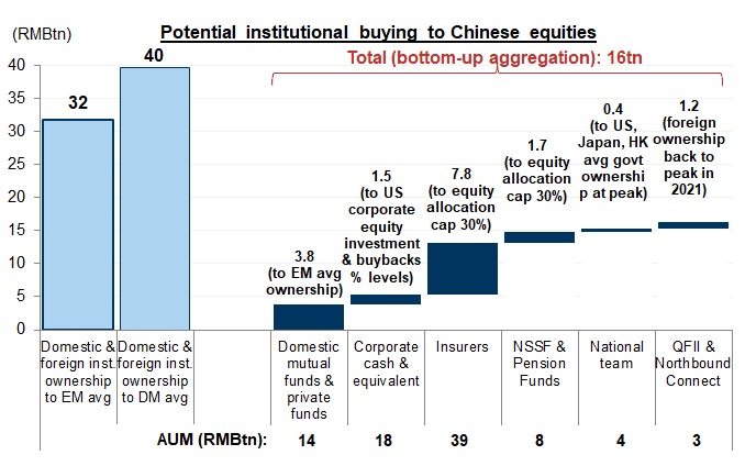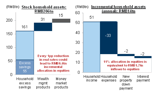 Additional potential equity inflows could come from 31TN yuan in WMP and 15TN yuan in MM funds (with flows sensitive to real-rate declines) plus more than 14TN yuan of annual “new money” seeking deployment amid a weaker property market.