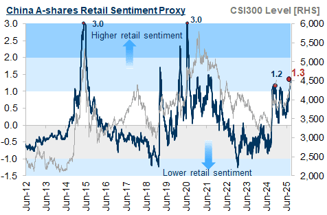 ...with more dry powder. Chinese households hold just 11% of assets in equities versus 55% in property and 27% in cash/deposits, leaving substantial “cash on the sidelines,” including about 55TN yuan of excess savings from the roughly 80TN yuan deposit buildup since 2020, much of which is maturing and thus re-deployable.