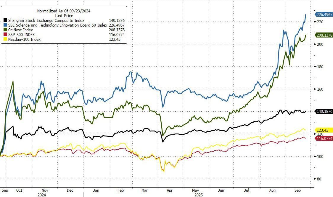 During this time, China A-shares total market cap surpassed 100TN yuan for the first time (+45% from 70TN yuan). SHCOMP surged from 2700 to 3900 level, while tech-focused benchmarks fared even better: STAR50 +115% and ChiNEXT +110%. During the same time, S&P returned a modest +16% and the Nasdaq rose +24%.
