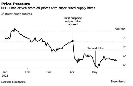 In April oil briefly tumbled to a four-year low under $60 a barrel after OPEC+ first unexpectedly announced they would bolster output by triple the scheduled amount. The move came even as faltering demand and Trump’s trade war were already crushing the market. This was followed by a second hike announcement one month later, and now a third one.